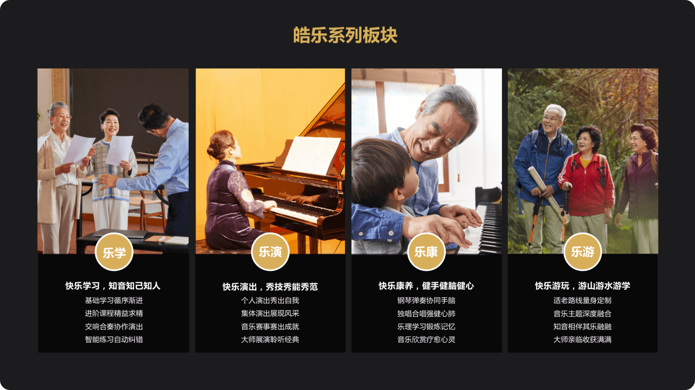 皓乐团是面向中老年群体的高端文娱项目。以“兴趣学习”+“音乐社交”双轮驱动,优化老年兴趣学习模式,紧贴中老年市场需求,涵盖乐学、乐演、乐康、乐游等板块,为老年文娱产业提供优质服务模式。